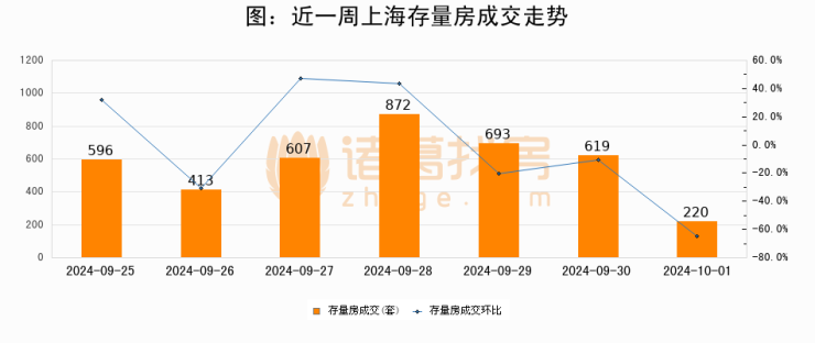 从存量房来看,2024年10月01日上海存量房单日成交220套,比昨日减少399套,环比下降64.5%。从近一周存量房成交来看,上海存量房日均成交套数为574套,10月01日单日成交220套,低于近一周平均水平61.7%。