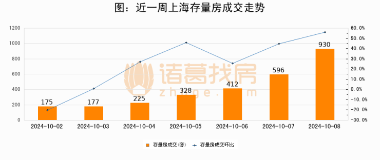 从存量房来看,2024年10月08日上海存量房单日成交930套,比昨日增加334套,环比上涨56%。从近一周存量房成交来看,上海存量房日均成交套数为406套,10月08日单日成交930套,高于近一周平均水平129.1%。