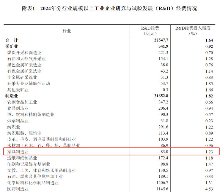 国家统计局数据:家居制造业2024年投入研究与试验发展经费83亿元 同比增长1.23%
