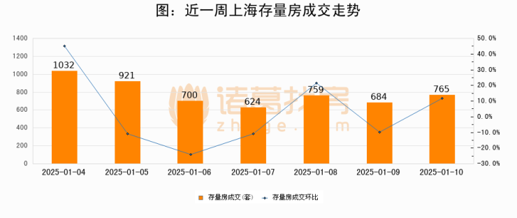 从存量房来看,2025年01月10日上海存量房单日成交765套,比昨日增加81套,环比上涨11.8%。从近一周存量房成交来看,上海存量房日均成交套数为783套,01月10日单日成交765套,低于近一周平均水平2.3%。