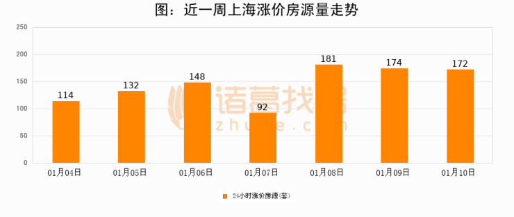 根据诸葛找房数据显示,上海24小时涨价房源量为172套,较01月09日减少2套,环比下降1.1%。与此同时,涨价房源占比小幅回落,对于购房者来说是一个入市窗口期,购房者可抓住时机入市。