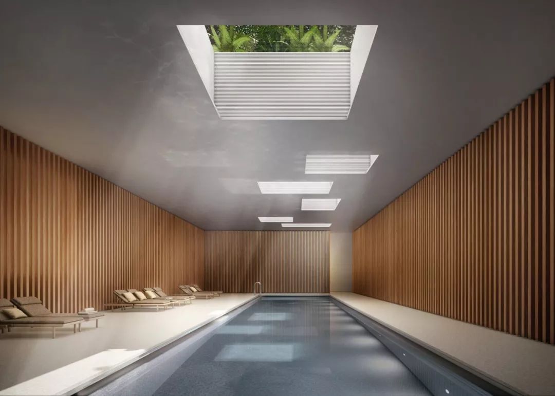 公寓内配备了室内游泳池,简约的设计让这里成为一个纯粹的功能空间,同时又不失美好的感受。