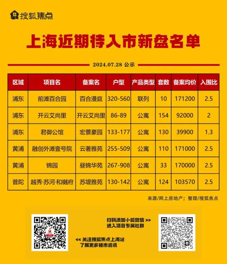 7月28日,网上房地产网站公示了《本市近期将上市新建商品住房项目一览表》,延续了近期的“少量多次”模式,共6个项目:浦东3盘、黄浦2盘、普陀1盘,合计561套房源。