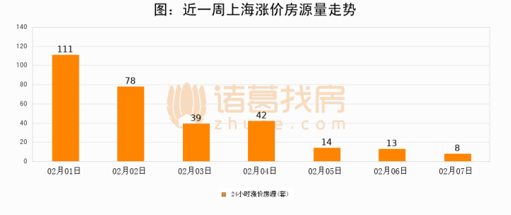 根据诸葛找房数据显示,上海24小时涨价房源量为8套,较02月06日减少5套,环比下降38.5%。与此同时,涨价房源占比小幅回落,对于购房者来说是一个入市窗口期,购房者可抓住时机入市。