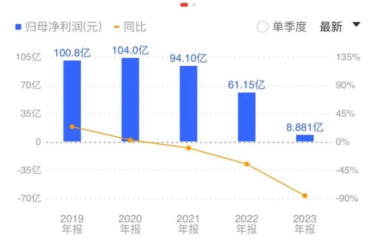 相比营收,净利润的数字就没有那么好看了。2023年,金地的归母净利润仅有8.881亿,同比大幅下滑85.48%。在这之前的2022年,净利润已经下滑了超过3成。再往下走,就是亏损线。