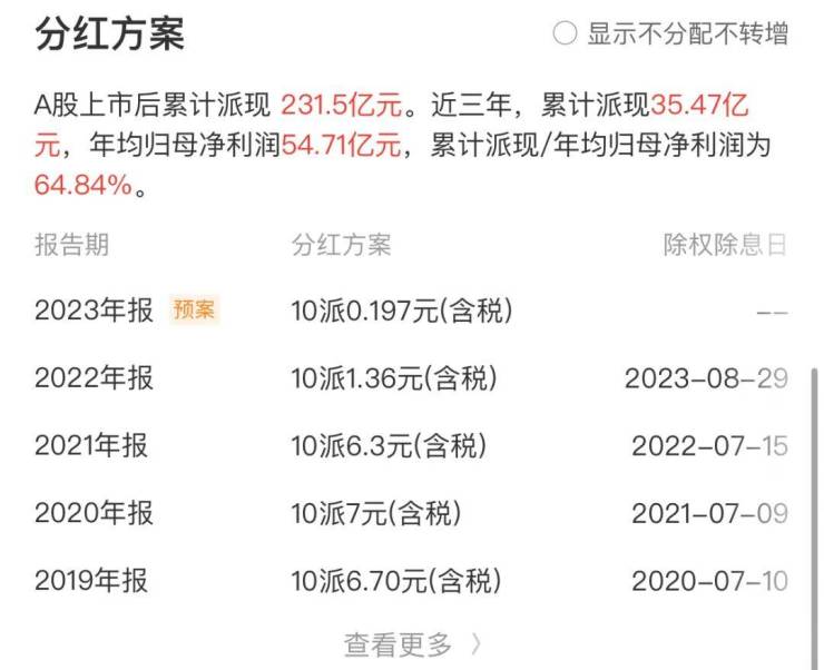 过去2年,金地的分红经历了2次连续大跳水。先是从2021年的10派6.3元大幅下滑到2022年的10派1.36元。2023年又再次下调到了10派0.197元。这个下滑幅度是很惊人的。