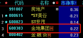 第二个数字是市净率。4月25日的数据,金地集团的市净率为 0.22。在地产板块中,仅高于st世茂和st美谷。可以说,它是所有还在正常运营的A股房地产股中,市净率最低的。可见市场对它的估值是严重偏低的。