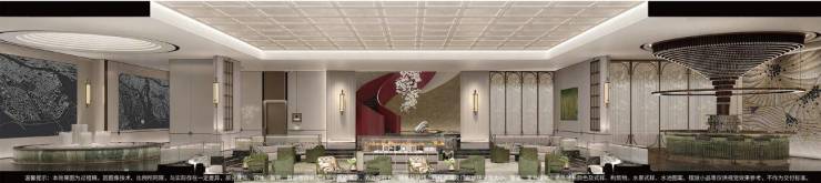约120米映波回廊:马赛克无边水景波光粼粼,大面积大理石景墙升华厚重质感,深色铁艺匹配水纹玻璃,光、水、廊静谧融合,刻画风尚洗心之旅。