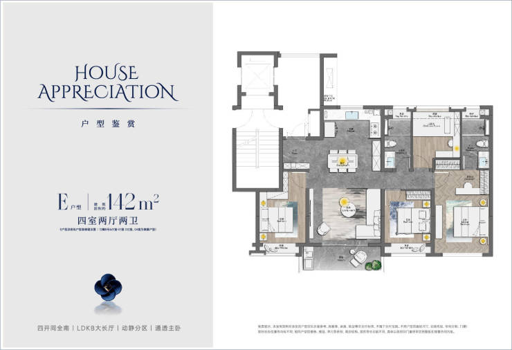 “LDKB+X”空间布局:本户型的一大亮点,是厨房、餐厅、客厅、大阳台+灵动空间(将次卧一体化连通),营造一个超大“十字公厅”,聚合更多生活功能;