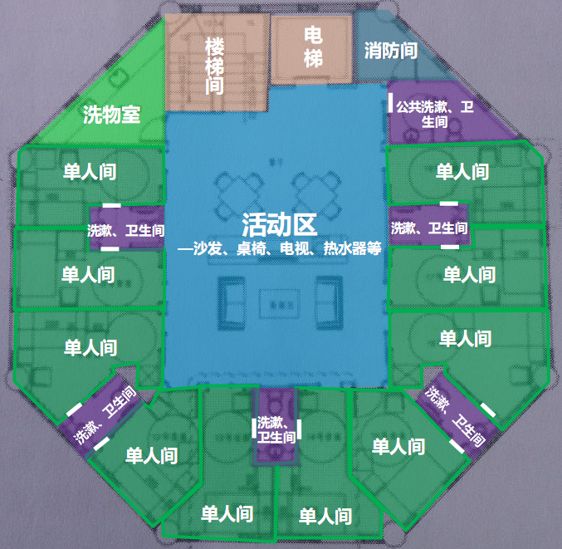 二层为隔层,10间10-15㎡单人间,两房公用卫生间(双侧开门),公共功能间仅有卫生间和洗物室,布局紧凑