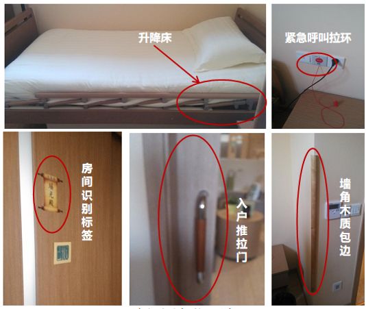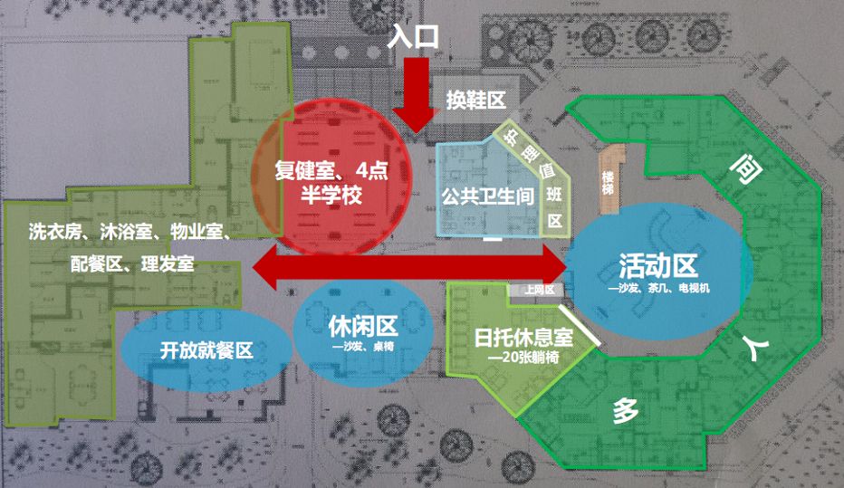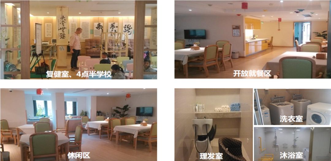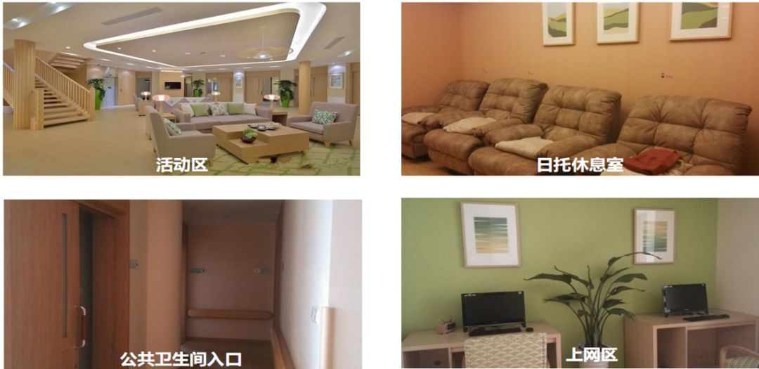 •东区:6间多人间(2-4人)、上网区、公共卫生间、日托休息室。西区:康复室、休闲区、就餐区、洗衣房、沐浴室、理发室