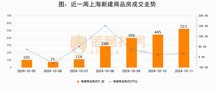 根据上海市房地产交易中心数据显示,2024年10月11日上海新建商品房成交523套,较昨日增加78套,环比上涨17.5%