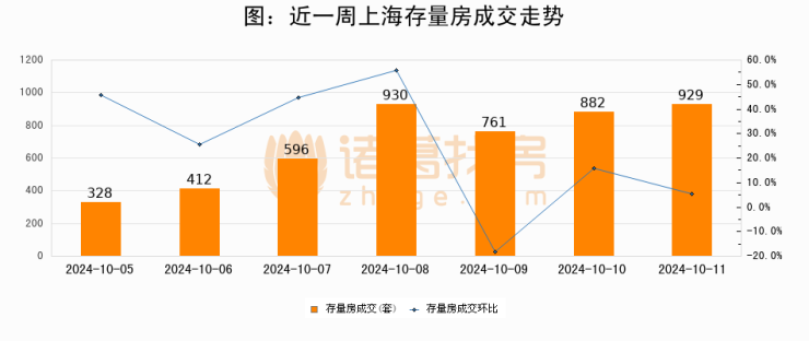 从存量房来看,2024年10月11日上海存量房单日成交929套,比昨日增加47套,环比上涨5.3%。从近一周存量房成交来看,上海存量房日均成交套数为691套,10月11日单日成交929套,高于近一周平均水平34.4%。
