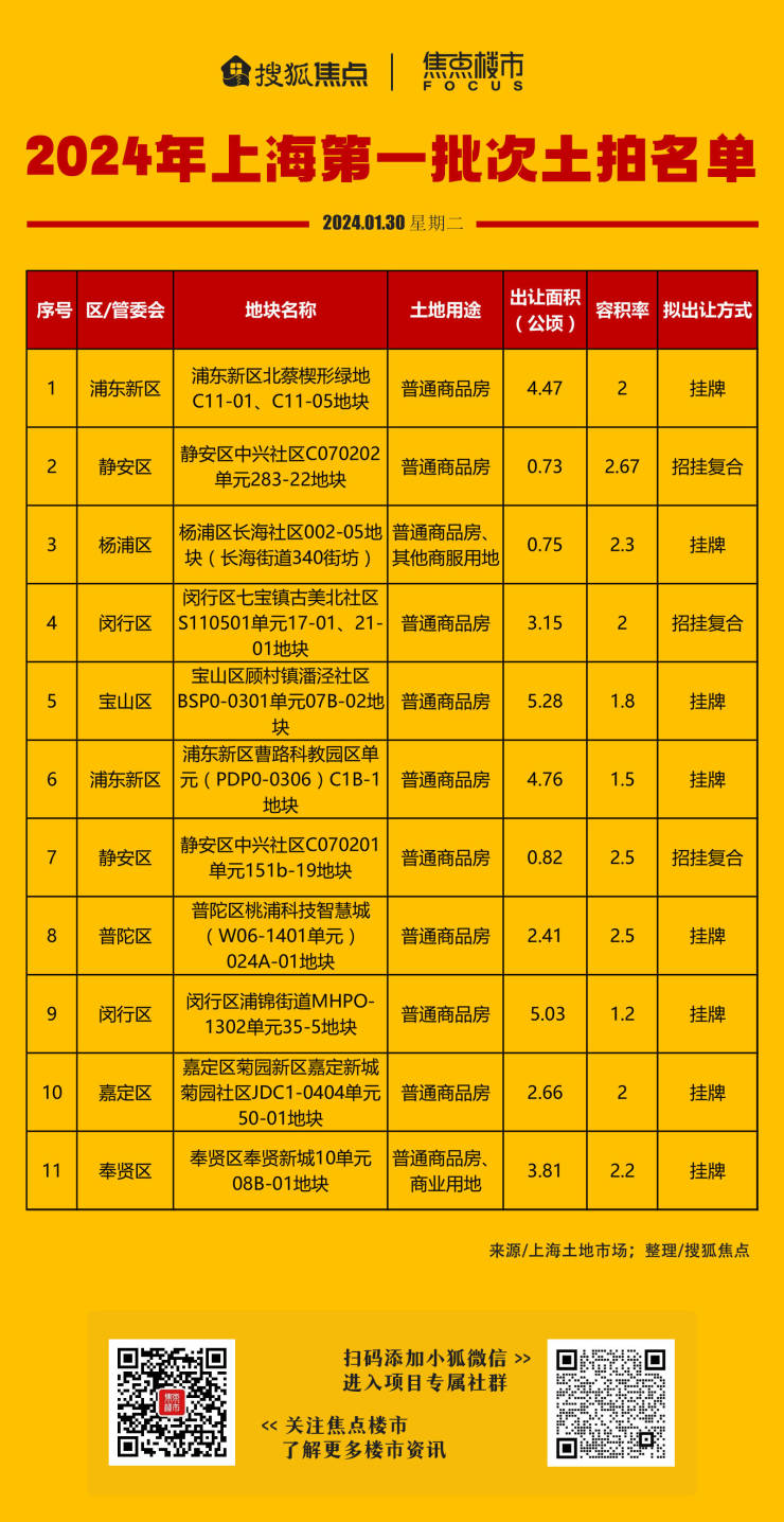 1月30日,上海土地市场官网发布公告,预告了2024年第一批次拟出让住宅用地名单,含浦东新区、静安、闵行各2幅,普陀、杨浦、宝山、奉贤、嘉定各1幅。11幅地块总出让面积28.84公顷。