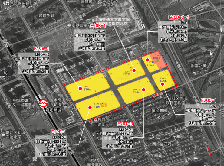 2022年7月,上海第三批次土拍中,中建二局以总价约643607万元,竞得嘉定区嘉定新城E19A-1、E19B-1、E20A-3、E20B-1、E20C-1、E20D-3地块,地块出让面积141581.2㎡,成交楼板价17460元/㎡,整盘房地联动价50400/㎡。