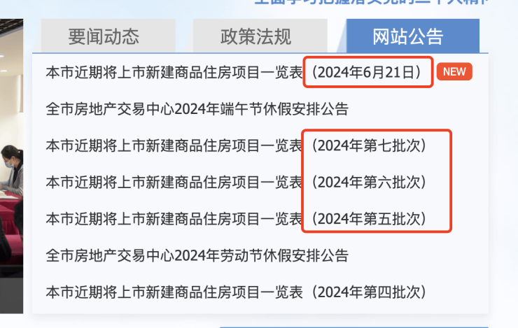 与之不同的是,今日的公示板上却不再显示第几批次,而是“近期将上市”。6月21日下午,一张截图显示:“上海新房上市不再集中公示”。