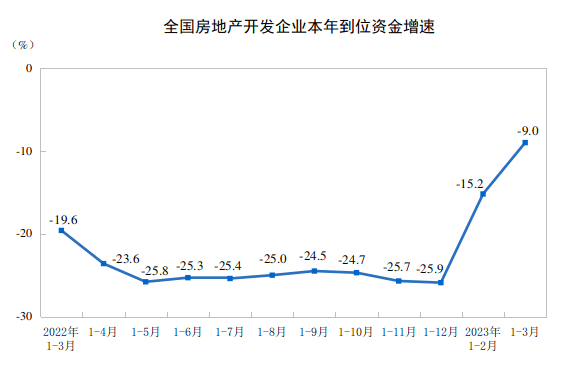 4月18日上午,国家统计局公布了《2023年1-3月份全国房地产市场基本情况》显示,一季度全国房地产开发投资25974亿元,同比下降5.8%;商品房销售面积29946万平方米,同比下降1.8%;商品房销售额30545亿元,增长4.1%;房地产开发企业到位资金跌幅大幅收窄,其中定金及预收款和个人按揭贷款跌幅已经收窄至2.8%和2.9%。