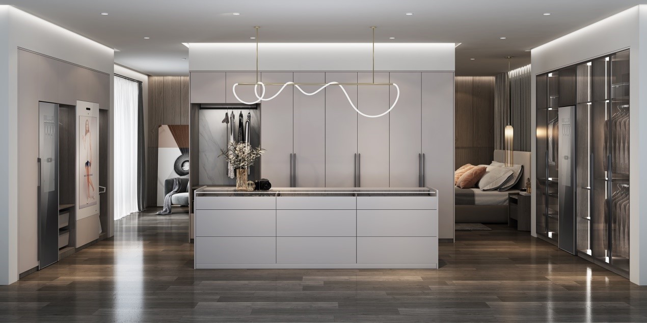 它将气质优雅、功能齐全的一体化衣柜与物联网智能系统融为一体,同时内嵌智慧衣帽间“数智化平台”,充分彰显现代科技对用户高品质生活的满足。