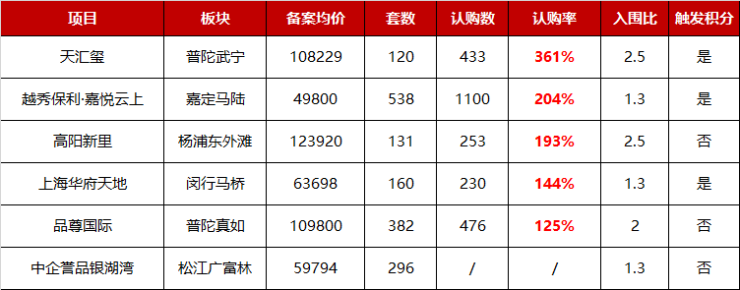 正在认购的6盘,3盘认购比超过1:1。网传要通宵排队的瑞仕半岛璟庭已收获1640+组认购,提前越线,预计触发积分。还有杨浦鞍山的中海海上和集,普陀武宁的招商苏河玺也都大受青睐。