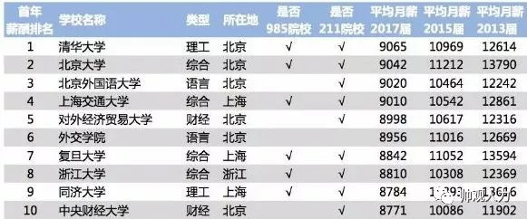 排名第1名的清华大学2017年平均月薪9065元,第200名的西安建筑科技大学2017年平均月薪3394元,毕业生平均月薪相差2.7倍。