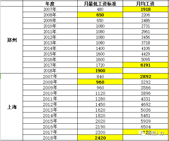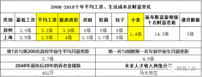 好,这是十年来郑州、上海两个城市工资涨幅的对比。郑州起点低,相对较低工资标准及月均工资上涨幅度都超过了上海。