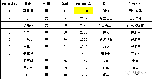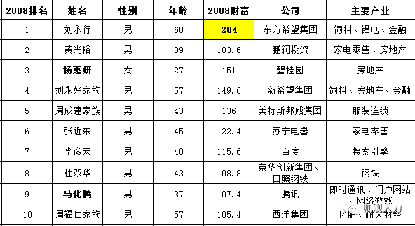 福布斯富豪榜排名前列名由2008年刘永好的204亿人民币变成2018年马化腾的3080亿人民币,财富扩大了15倍;前十名进入排行榜的财富平均增加了14.3倍。