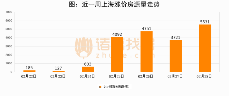 根据诸葛找房数据显示,上海24小时涨价房源量为5531套,较02月27日增加1810套,环比上涨48.6%。与此同时,涨价房源占比小幅扩大,业主信心有所提升。