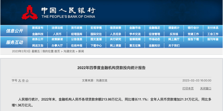 2月3日,人民银行发布2022年四季度金融机构贷款投向统计报告。