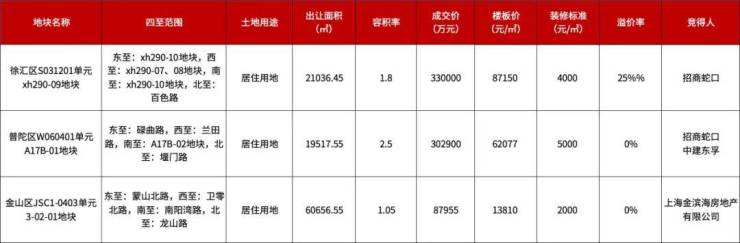 普陀区W060401单元A17B-01地块仅一组竞买人报名,最终由招商蛇口与中建东孚联合体以30.29亿元底价竞得,楼板价62077元/㎡,装修标准不低于5000元/㎡。