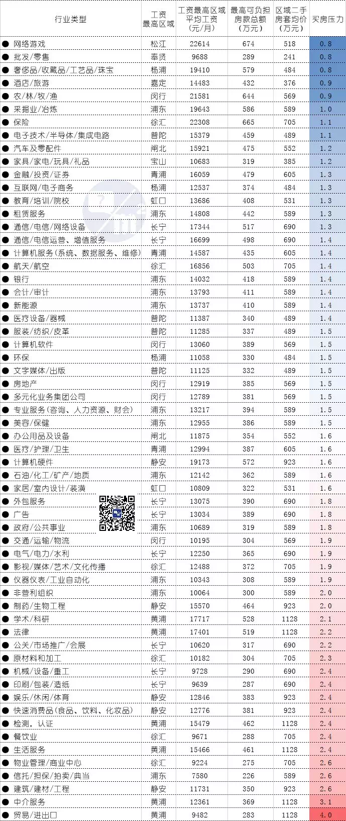 按照以上方法,我们把上海各个行业买房压力进行了测评,测评结果如下: