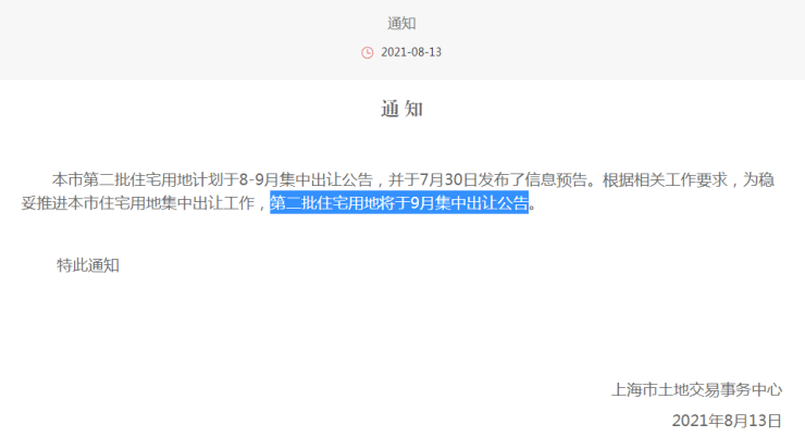 8月13日,上海土地交易市场官网发布通知。本市第二批住宅用地计划于8-9月集中出让公告,并于7月30日发布了信息预告。根据相关工作要求,为稳妥推进本市住宅用地集中出让工作,第二批住宅用地将于9月集中出让公告。