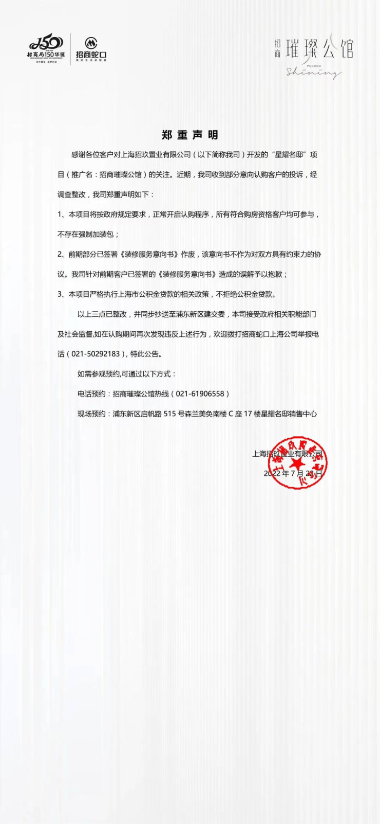 今日,招商蛇口上海官微发布“郑重声明”,表示招商璀璨公馆正常开启认购程序,不存在强制加收装修包;前期部分已签署《装修服务意向书》作废;本项目严格执行上海市公积金贷款相关政策,不拒绝公积金贷款。