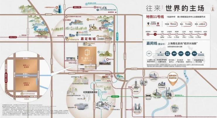 从越秀保利嘉悦云上靠近的马陆站出发,1站南翔印象城、7站进中环;未来2站至南翔站即可换乘嘉闵线,4站直达大虹桥、7站可抵七宝。