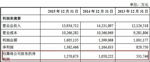 据较新三季报显示,公司实现营收1163.78亿元,同比增4.49%,实现净利润128.08亿元,同比增16.31%。2013年、2014年和2015年,公司实现的归属母公司净利润分别为:531,746万元、1,050,222万元和1,270,673万元。