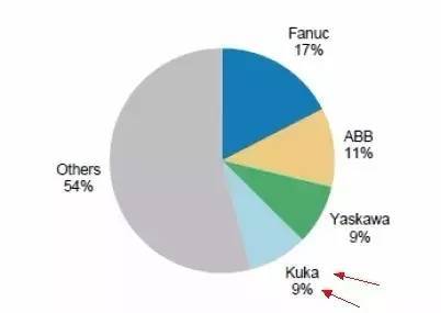 2015年度,全球前四大公司在整个行业中的市场份额占比均接近40%,其中,库卡销售收入29.7亿欧元,占比9%。