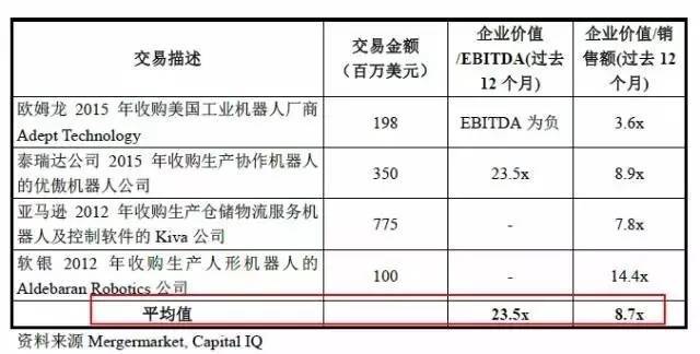 机器人领域的并购交易不多,但从已发生过的来看(欧姆龙收购Adept、泰瑞达收购优傲、亚马逊收购kiva、软银收购Aldebaran),企业价值/EBITDA均值23.5x、企业价值/销售额8.7x,也高于本案的估值水平。