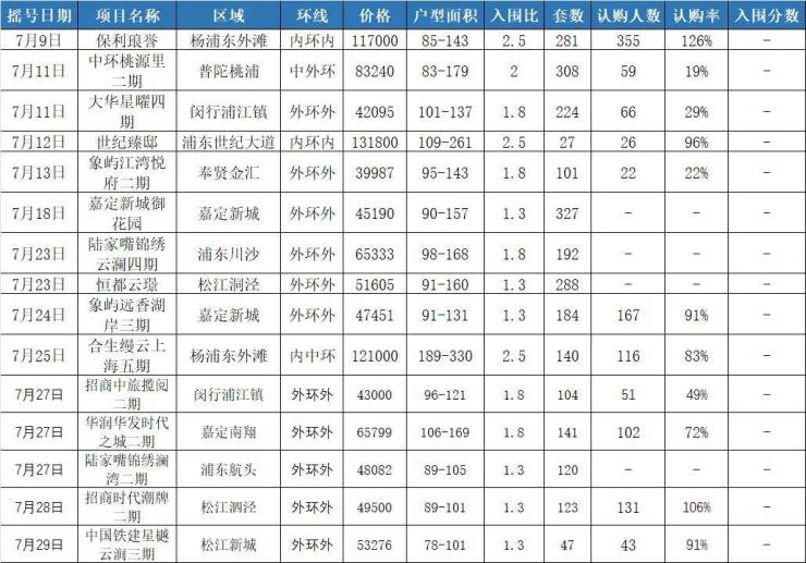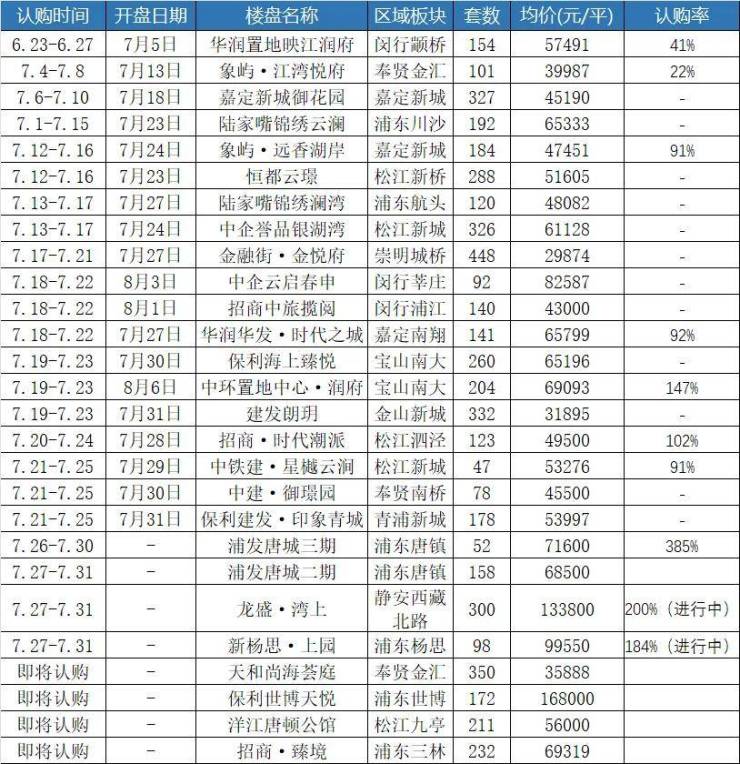 而在本月认购的楼盘中,前三周均没有触发积分的楼盘,直到上周才略有起色。位于唐镇的浦发唐城三期认购率385%,触发了积分,这也是七月第一个触发积分的新盘,更是第七批次以来首个触发积分制项目。