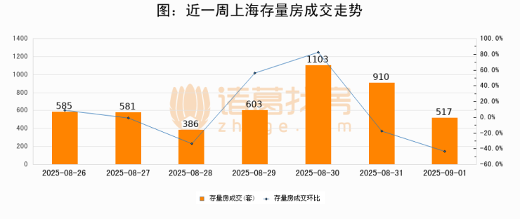 从存量房来看,2025年09月01日上海存量房单日成交517套,比昨日减少393套,环比下降43.2%。从近一周存量房成交来看,上海存量房日均成交套数为669套,09月01日单日成交517套,低于近一周平均水平22.7%。