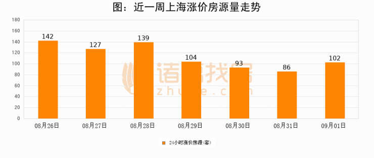 根据诸葛找房数据显示,上海24小时涨价房源量为102套,较08月31日增加16套,环比上涨18.6%。与此同时,涨价房源占比小幅扩大,业主信心有所提升。