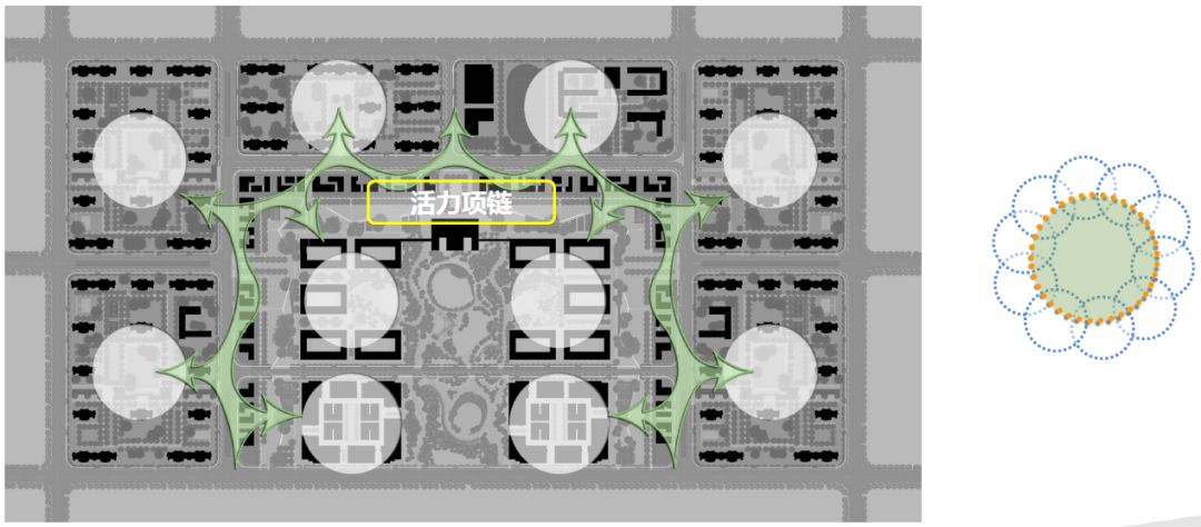 以U形中心活力轴带动主要公共功能,串联各个社区,形成”活力项链“。