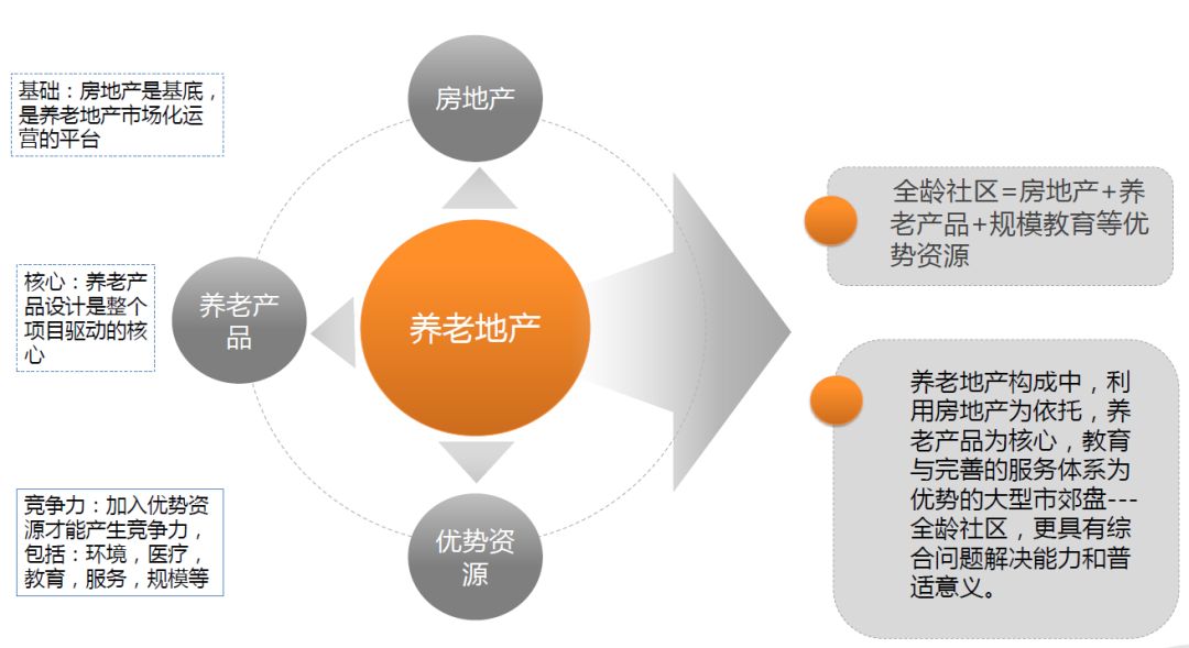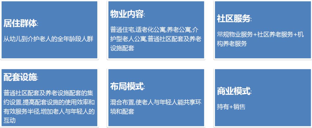 全龄社区的养老模式:将养老地产混合植入到成熟的住区规划、开发、运营和服务整个流程中,老人与其他各年龄段人共同生活在同一大型社区,各个年龄段老人都有相匹配的养老物业和服务,创造以生活体验至上的一生之城。