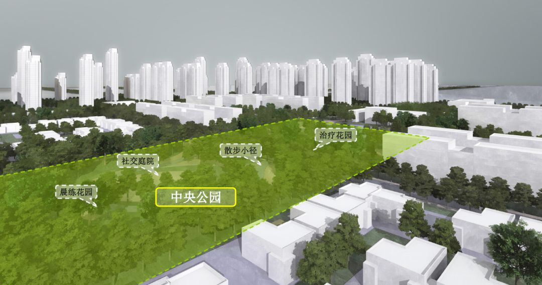 •中央公园包含治疗花园、散步小径、社交庭院、阳光草坪、晨练花园