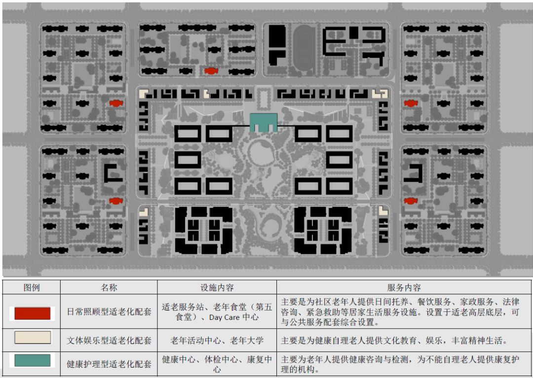 养老配套两级分布。根据设施的使用频率和半径需求设置于活力带及街坊内。满足保健、教育、社交、护理、医疗需求。