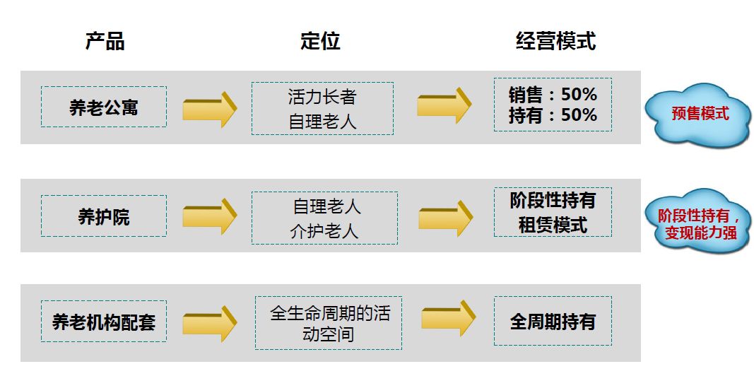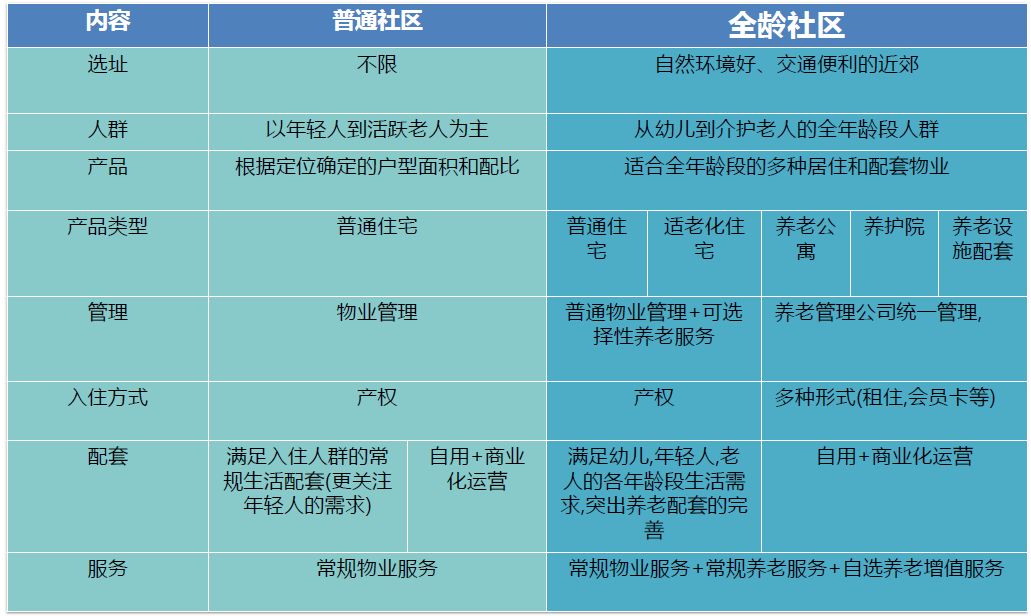 4.全龄社区配置普通商品住宅、适老住宅、销售型老年公寓、出租老年公寓以及介护机构,前三类是销售型物业,后两类是持有型物业。