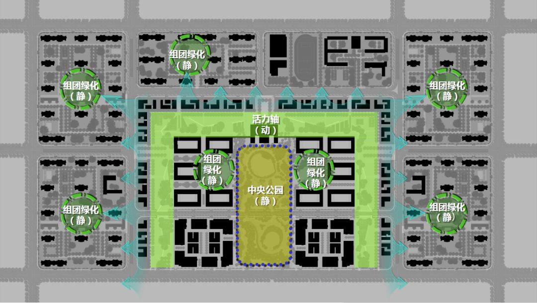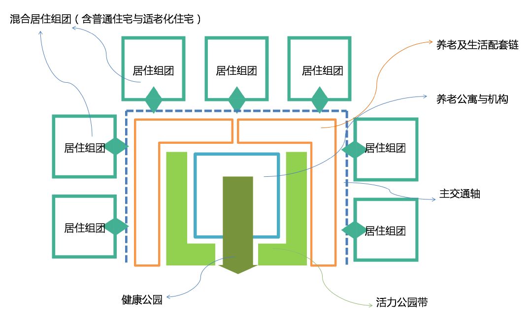 通过搭建中央公园-活力轴-居住组团的三级景观构架,满足老年人对运动、休憩、交往的不同景观需求。