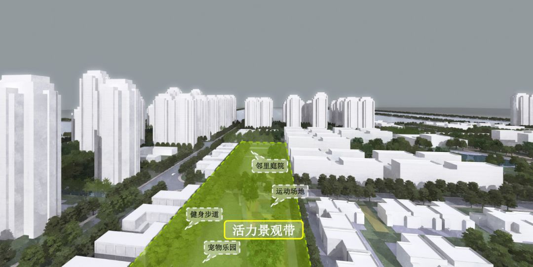 位于活力轴的景观带包含健身步道、亲子乐园、艺术沙龙、阅读天地、邻里庭院、宠物乐园、戏曲沙龙、体育天地等场地,满足全年龄需求
