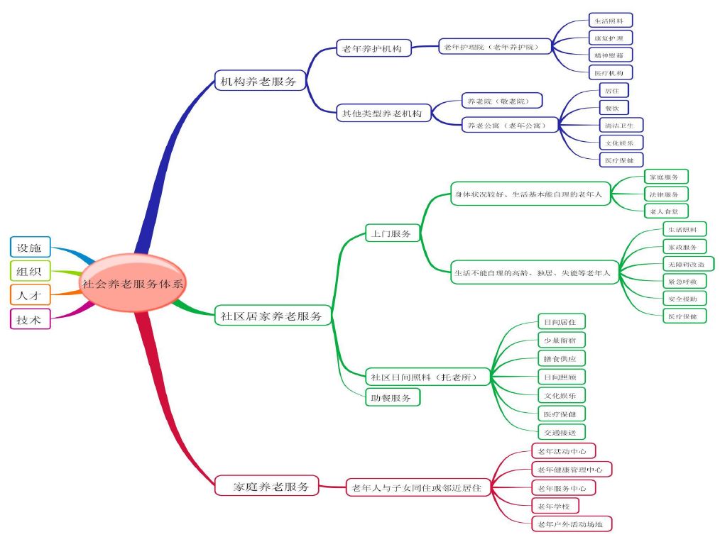 国办发〔2011〕60号文指出,社会养老服务体系建设是应对人口老龄化的一项长期战略任务,坚持政府主导,鼓励社会参与。以居家为基础、社区为依托、机构为支撑,以满足老年人养老服务需求、提升老年人生活质量为目标,面向所有老年人,提供生活照料、康复护理、精神慰藉、紧急救援和社会参与等设施、组织、人才和技术要素形成的网络,以及配套的服务标准、运行机制和监管制度。