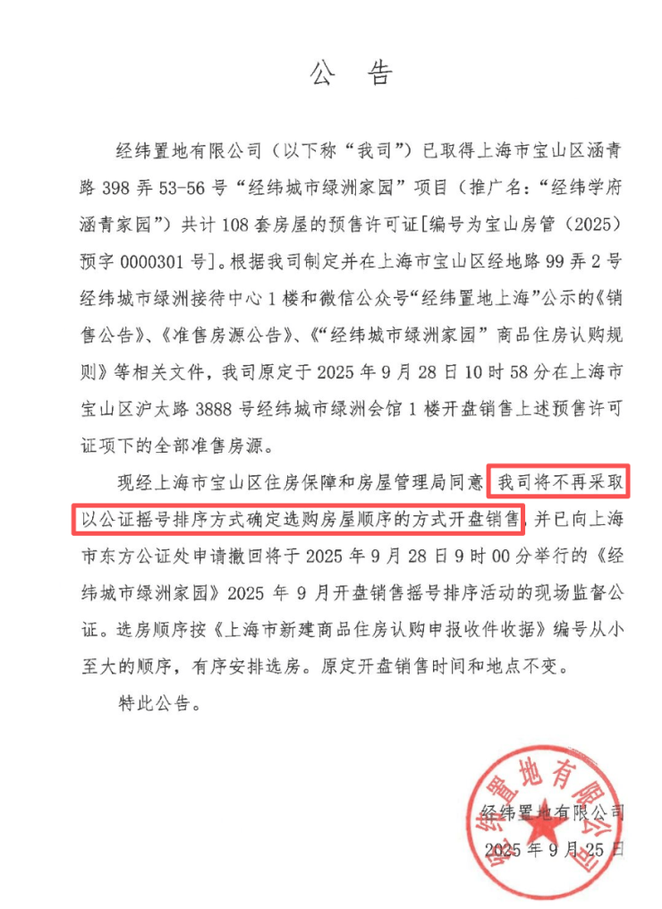 事实上,项目官方曾于9月25日发布公告“不再采取公证摇号方式开盘”。