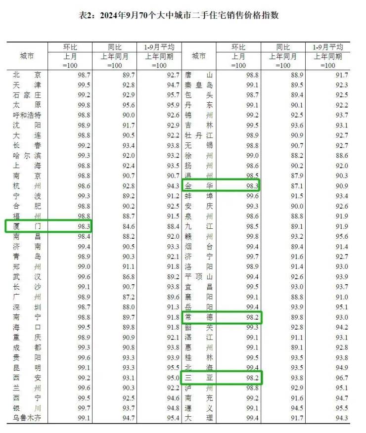 二手住宅方面,无城市环比上涨、持平,环比下跌的城市有70个。其中常德、三亚以跌幅1.8%领跌,厦门、金华跌幅1.7%。