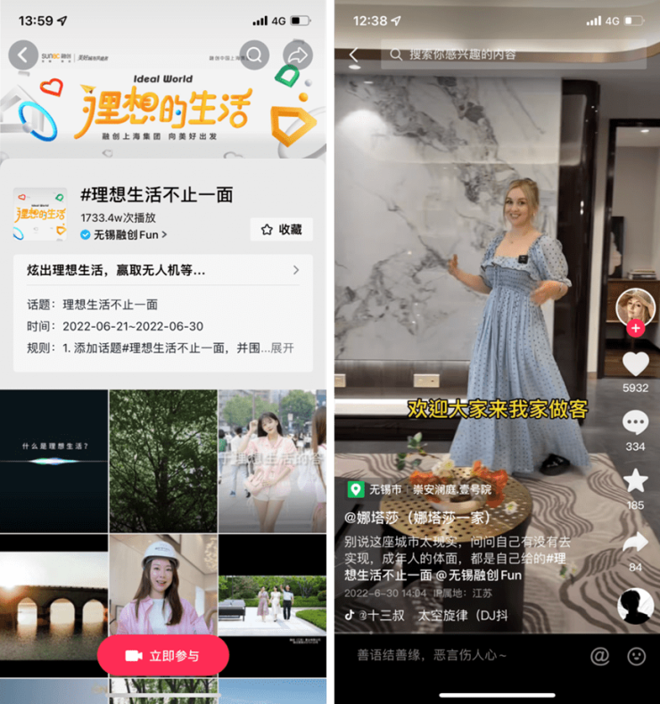 为了同频探索新时代、新生活下的客群价值观念、生活方式等,我们联合抖音发起了“理想生活不止一面”视频挑战赛(抖音搜索话题#理想生活不止一面),吸引了上海、南京、无锡、苏州等20城的网友共同参与,其中不乏是小太阳啊、外国友人娜塔莎一家等百万粉丝网红,全网曝光超1700万,他们的分享里,有都市精致,有市井烟火,有繁华高楼,亦有烂漫山野……见证着城市的更迭,经历着生活的千姿百态,一起奔赴这场热爱与追逐理想的探索之旅。